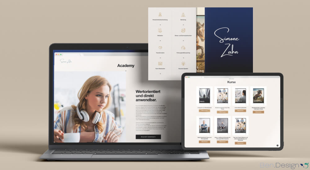 Das finale Design zeichnet sich durch großzügigen Weißraum, dunkle Blautöne und gezielte Gold-Akzente aus, die Eleganz und Wertigkeit vermitteln. Hochwertige, emotionale Bilder unterstreichen die persönliche und vertrauensvolle Ansprache. Die Website positioniert Simone Zahn klar als Expertin und schafft eine überzeugende digitale Präsenz für ihre Angebote im Bereich Coaching, Moderation und Konfliktmanagement.