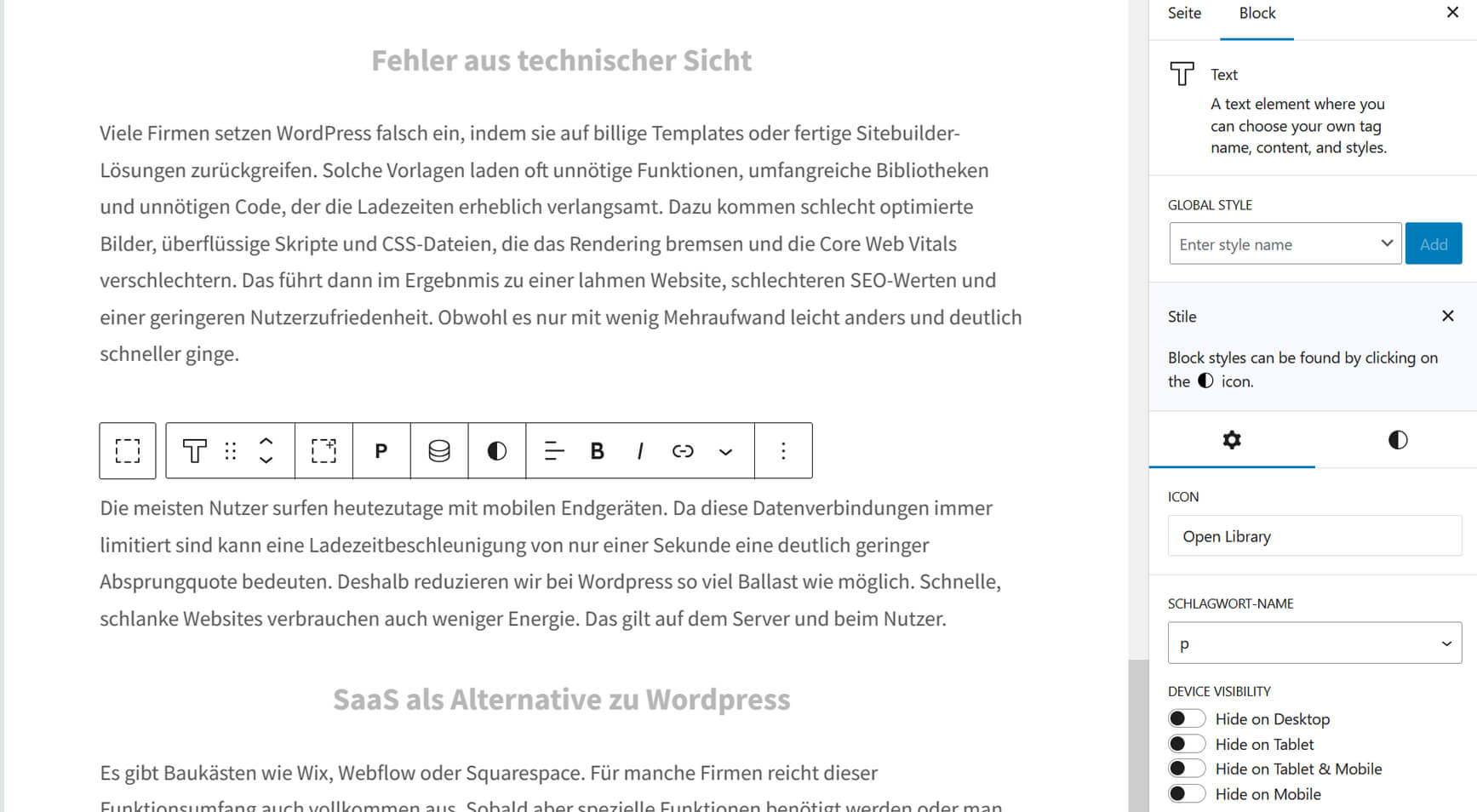 Für aufwendige Funktionen oder zusätzliche Sitebuilder besteht meist kein Bedarf, da WordPress Websites den Gutenberg-Editor bereits integriert anbietet. Nach einer kurzen Eingewöhnungszeit lässt der sich schnell und effizient nutzen. Indem von Wordpress bereitgestellte Funktionen verwendet werden statt die von Drittanbietern ergeben sich folgende Vorteile: